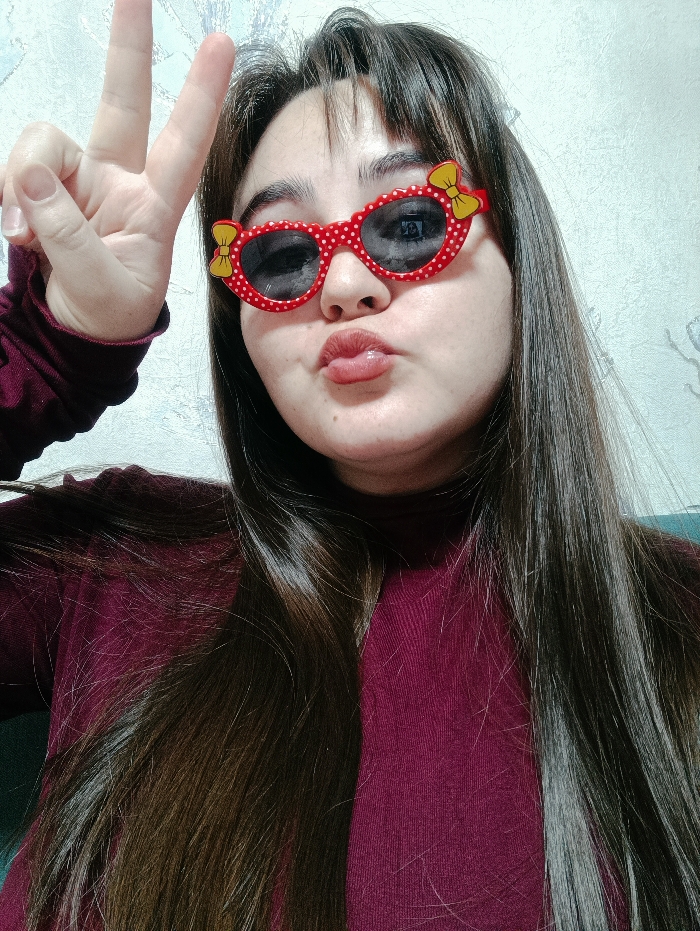 The image captures a close-up, chest-up portrait of a single individual, identified as female, posing indoors against a light-colored, subtly patterned wall. The individual has long, straight, dark brown hair with bangs, framing a light-skinned face. They are wearing a dark reddish-purple, long-sleeved top with a high neckline. A pair of distinctive red, heart-shaped sunglasses with white polka dots and small yellow bow accents on the upper corners obscure the eyes; the lenses are dark. The individual's lips are pursed forward in a "kiss" or "duck face" gesture. Their right hand is raised on the left side of the frame, forming a "peace sign" with the index and middle fingers extended vertically. The background wall displays a faint, possibly floral or abstract, lighter pattern. The scene is situated in what is identified as the city of Noviy, Russia, though no explicit geographical markers are visible within the photograph.