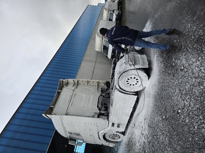 The scene depicts an outdoor commercial or industrial area in Ostend, Belgium, under an overcast sky. A white semi-truck tractor unit is positioned on a dark, wet asphalt surface, heavily coated in white cleaning foam from its cab to its rear axle. A male individual, viewed from the rear, is actively engaged in washing the truck. He wears a dark blue jacket, blue jeans, and a dark beanie, holding a silver-colored pressure washing lance directed towards the truck's rear wheels and chassis. White foam accumulates on the ground around the truck and the individual. In the background, a large building features a prominent blue corrugated metal upper facade above a gray concrete base. To the right of the individual, several white commercial vans or smaller trucks are parked in a line in the middle ground.