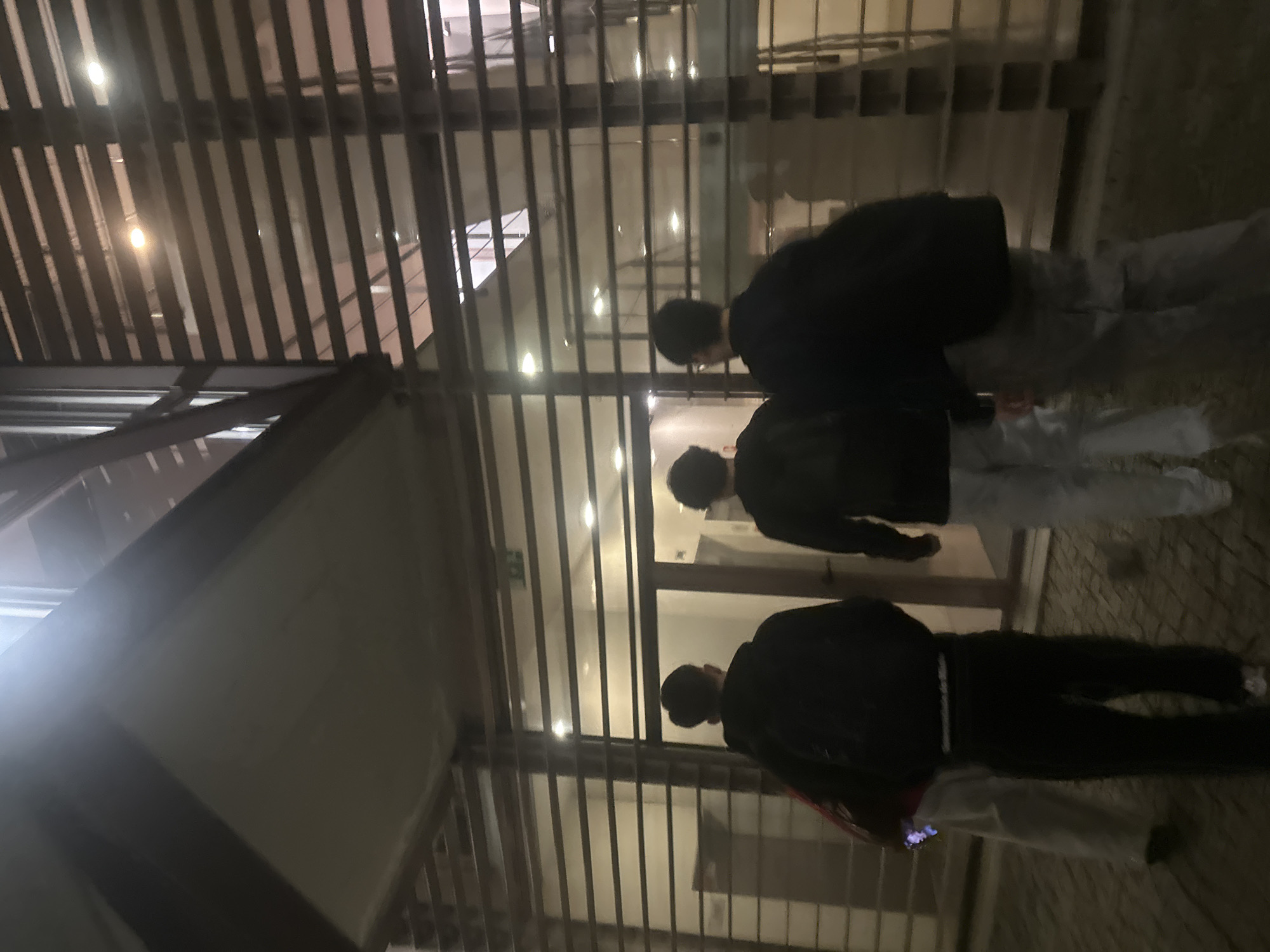 This image depicts four individuals from behind, walking on an irregularly paved surface towards a modern building in Guimarães, Portugal, during low-light conditions. The building presents a facade primarily composed of glass panels overlaid with horizontal, dark-toned louvers, through which interior illumination is visibly reflected. A flat, dark canopy extends over the central section of the building, beneath which a glass double-door entrance is situated, featuring a green "EXIT" sign above it. The closest individual on the left wears light-colored trousers and a dark upper garment with a visible red layer, holding a luminous object in their left hand. The next individual, positioned centrally, wears a dark hoodie, dark pants, and a dark backpack. To their right, a third individual is dressed in a dark jacket and light-colored pants, also carrying a backpack. A fourth individual's upper torso is partially obscured behind the third person on the right. All subjects are oriented towards the building, indicating movement in that direction.
