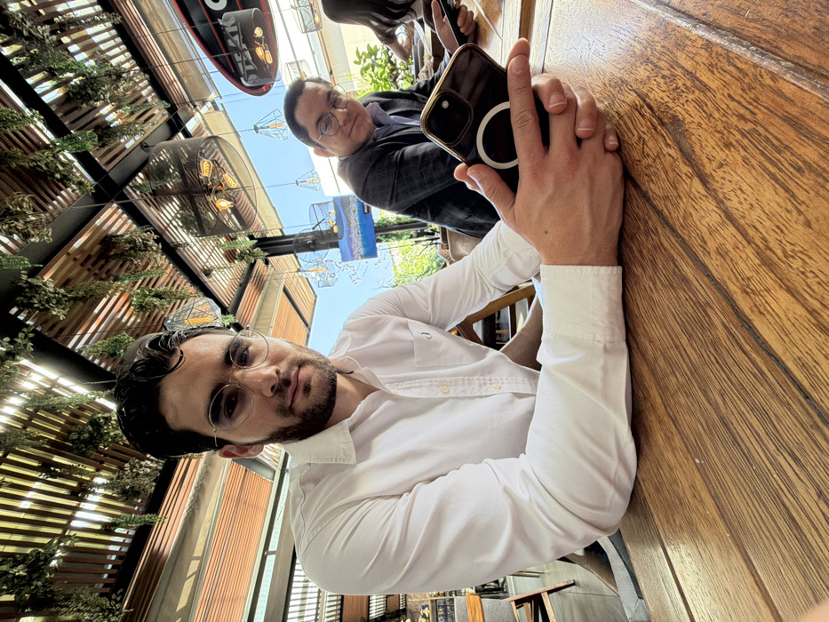 The image displays two males and a partially visible third individual seated at a wooden table in an outdoor or semi-outdoor restaurant patio during clear daytime conditions