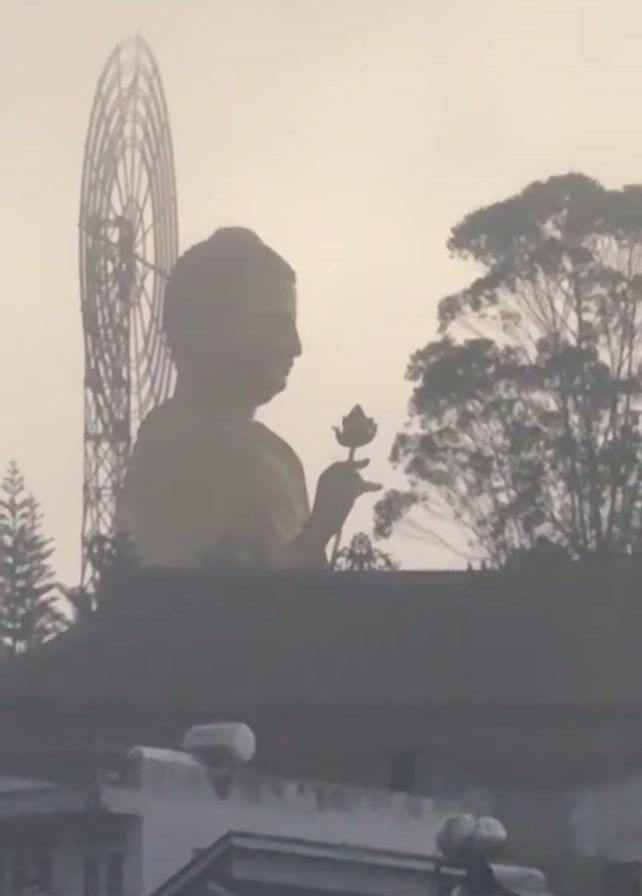 distant view of a town shrouded in mist, with a large Buddha statue holding a flower visible on a hill overlooking the buildings