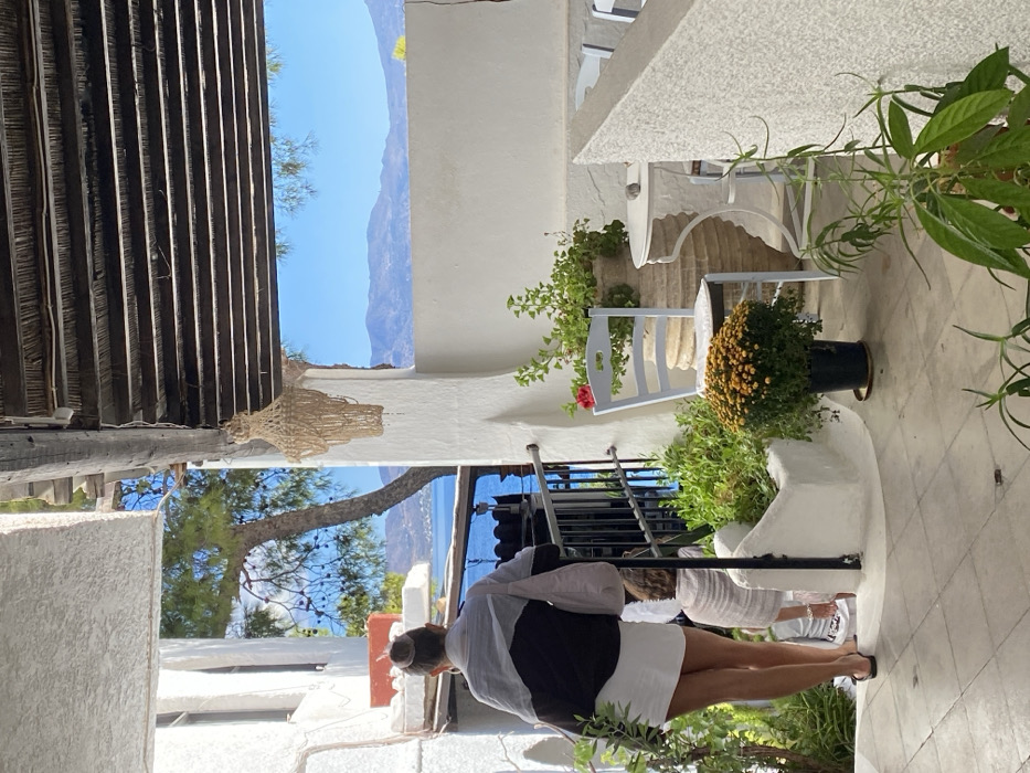 The image depicts an outdoor patio or walkway in Megalochori, Greece, featuring traditional white-painted architecture and a distant sea view