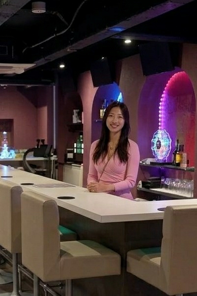 An adult East Asian female is depicted standing behind a white bar counter in an indoor commercial establishment