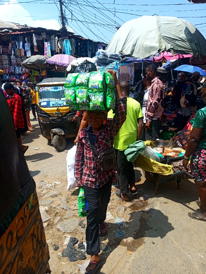 An outdoor market scene unfolds in Fegge, Nigeria, under a bright sky