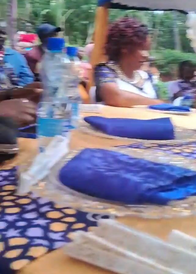 group of people gathered under a tent, likely for an event or celebration. The scene is anchored by a table decorated with a gold tablecloth, blue napkins, and a blue and yellow patterned runner. A decorative vase filled with white flowers sits prominently on the table. Attendees are dressed in various outfits, with several women wearing blue and gold patterned dresses. A man in a gray suit stands at the table speaking into a microphone while holding papers, suggesting he is giving a speech or making an announcement. The tent overhead is draped in blue and gold fabric, with a decorative shield-like object hanging from the ceiling. The overall atmosphere appears festive and celebratory. The setting suggests an outdoor event, possibly a wedding or family gathering, in a place with lush vegetation.