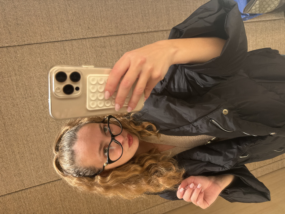 A female subject is depicted taking a selfie in an indoor setting with light brown, vertically paneled, textured walls, likely a fitting room or elevator, located in Barcelona, Spain. The subject has long, curly auburn hair, styled partly up. She wears black cat-eye spectacles and has her lips slightly pursed. Her attire consists of a light-colored knit top under a dark blue/black puffer-style jacket with wide, elbow-length sleeves and multiple metallic zippers and snaps. Her left hand holds a smartphone, specifically an iPhone with a clear case and a white, rectangular pop-it fidget toy attached to the back, positioned in front of her face. Her visible nails are manicured with a pale pink polish. A portion of a light-colored bag featuring a repeating pattern, consistent with a luxury brand logo, is partially visible in the lower right section of the image, appearing behind the subject.