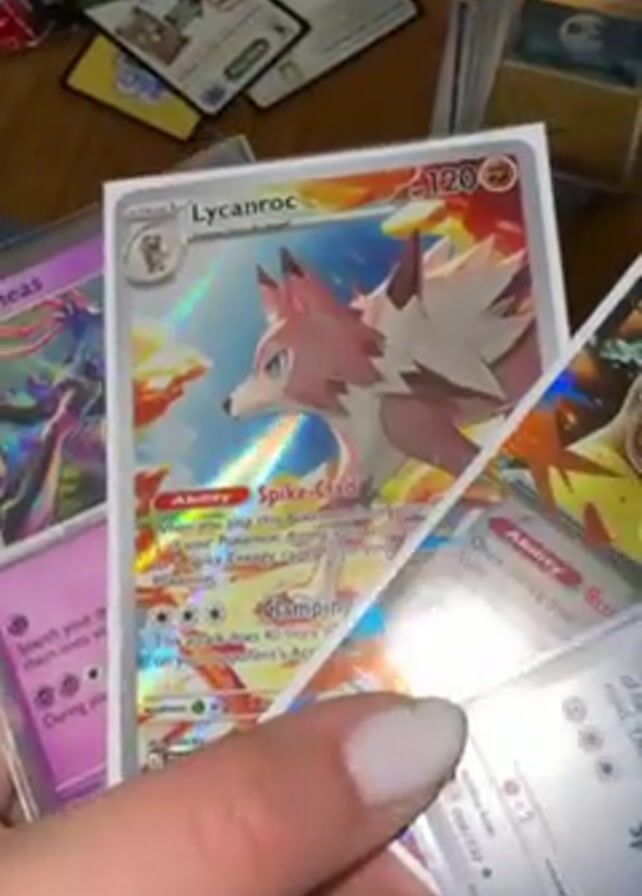 A person is holding three Pokémon cards in their hand. The top card is a Lycanroc, the second card is a Gurdurr, and the third card is a Grovyle. All the cards are in plastic sleeves. The person is sitting on a pair of denim pants. A pile of other Pokémon cards and packaging are scattered on a wooden floor in the background.