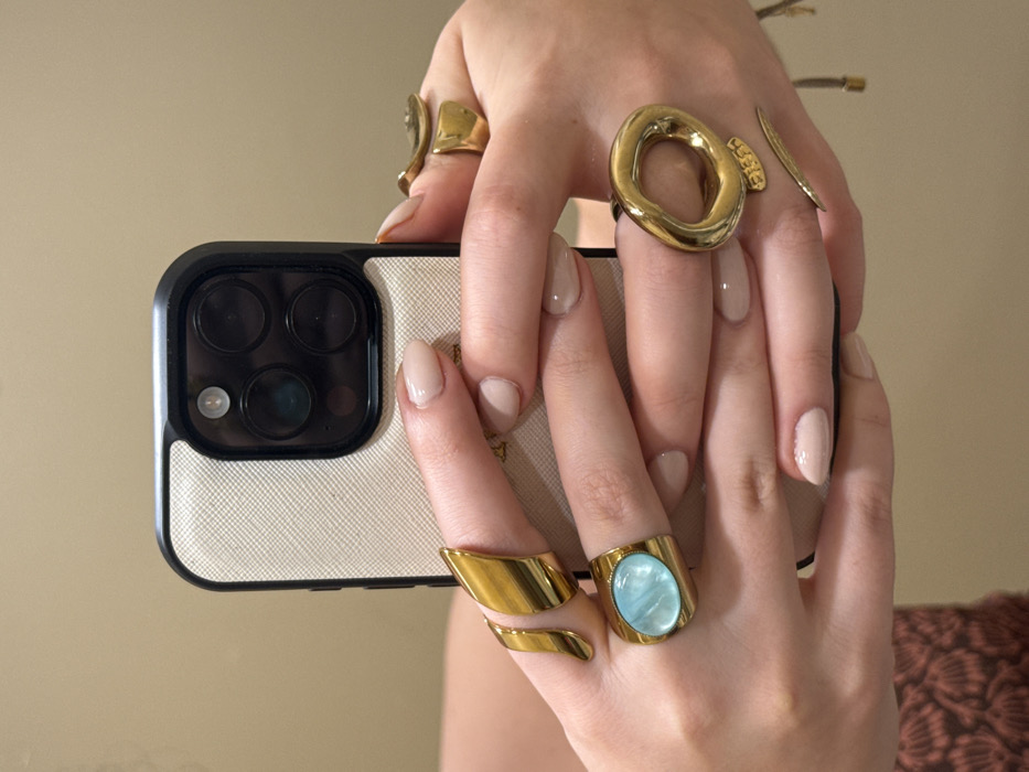 A person holds an iPhone encased in a textured, light-colored case with a black border. They wear multiple gold-toned rings of varying designs on their fingers. One ring features a turquoise stone. The hands are positioned in front of a plain, light-colored background. The focus is on the hands, rings, and the back of the phone. The lighting is soft, creating a warm tone across the scene.