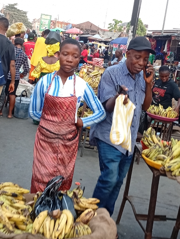 A bustling market scene is captured in a full shot. A young person in a striped shirt and red apron stands confidently amidst a display of plantains. An older man, wearing a blue striped shirt and black cap, is engaged in a phone conversation nearby. Ripe plantains are prominently displayed on tables and in bags, suggesting they are the primary commodity. The background is filled with people and market stalls, creating a lively and crowded atmosphere.