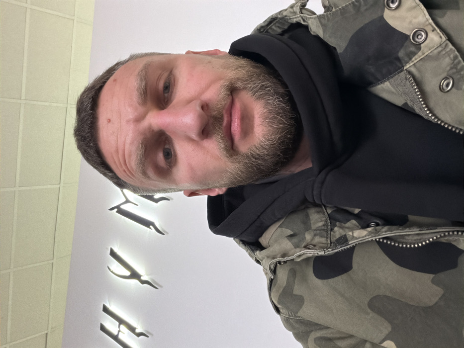 A male individual, appearing to be in his 30s or 40s, is depicted in a close-up, frontal selfie indoors