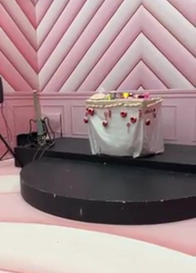 stage in a room with a pastel pink chevron patterned wall. A black, rounded stage sits in the center, with a smaller, rectangular platform elevated slightly on top. On this platform is a small table covered with a white cloth decorated with dangling red heart ornaments. Various items are set on the table’s surface. To the left of the stage, a guitar and a speaker on a stand are visible. The room is likely a set or a themed event space, given the decorative elements and the stage setup. Music plays in the background.