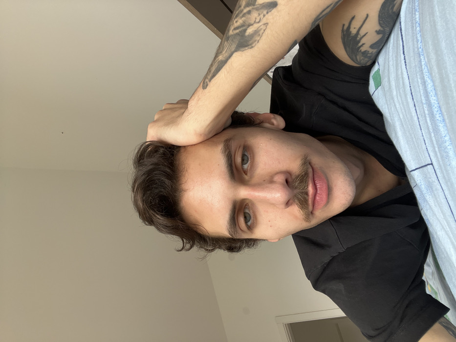 A male individual is depicted in a close-up, chest-up view within an indoor setting, identified as Bečići, Montenegro. The individual has dark, wavy hair, light-colored eyes, and a mustache. He wears a black short-sleeved top. He is observed in a semi-reclined position, resting on a light blue bed sheet patterned with darker blue grid lines and a small green rectangular element. His left arm is bent, with the hand resting on his forehead/hairline. Multiple tattoos are visible on his left arm: a raptor-like bird on the forearm, a dark winged creature on the upper arm, and an abstract wave design on the lower arm. The background consists of a plain light-colored wall. A partial white-trimmed doorway is visible on the left side of the background, and a dark brown vertical furniture piece is partially visible on the right.