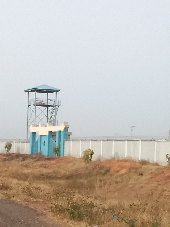The image displays a security perimeter in Kerang, Nigeria, under a hazy, pale gray sky
