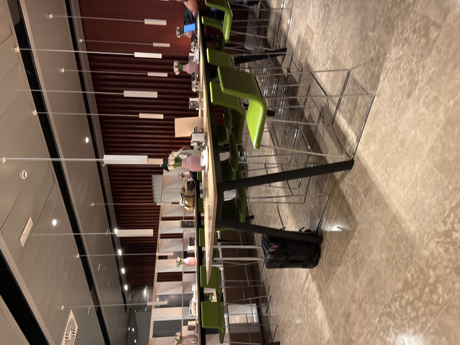 The image depicts a seating area in the Gran Canaria Airport in Telde, Spain. The scene shows a long table with several green chairs, and a black suitcase against the wall. Several long pendant lights are suspended above the seating area. The background wall is a textured, dark red, and there are some white shelves behind the table. The floor is a light beige tile. There are a few people standing around the area, including a person at a computer. The scene is well-lit, and the space appears clean and modern.