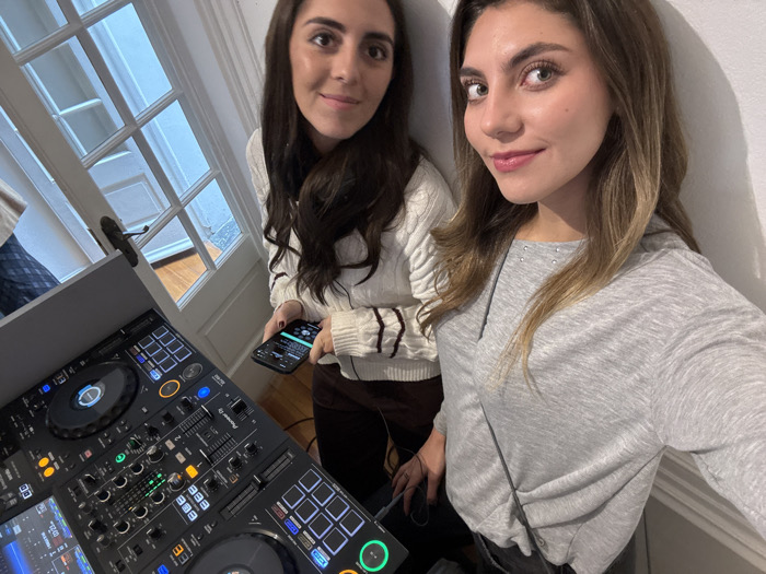 Two young adult females are depicted indoors, positioned closely, appearing to capture a selfie. The female on the left has dark hair, wears a white cable-knit sweater with brown stripes, and holds a black smartphone displaying a music application interface. White earbuds are connected, with one visible in her left ear. The female on the right has lighter brown hair and wears a grey long-sleeved top with embellishments near the collar. Both individuals are looking directly at the camera. In the foreground, a multi-channel professional Pioneer DJ controller is prominently displayed. This equipment features two large jog wheels, numerous faders, knobs, and illuminated buttons in blue, orange, green, and red, along with digital display screens. The background shows a white-framed glass door with multiple panes, through which a dimly lit exterior and a wooden floor are visible. To the far left, a blue and white patterned object is partially visible. The immediate wall surfaces are white. There are no specific visual identifiers within the image to corroborate a location in Mexico City, Mexico.