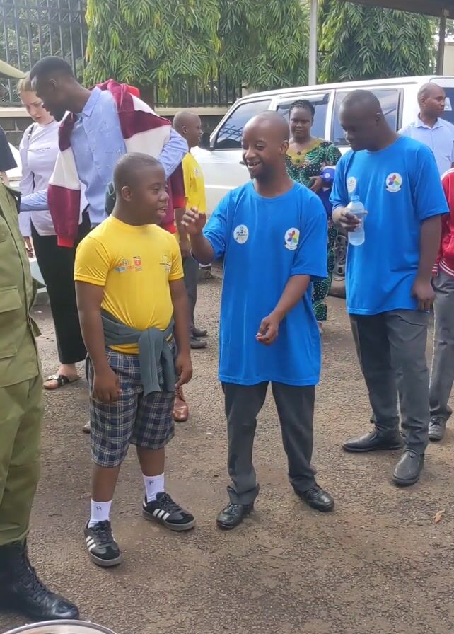 group of people outdoors, with two of them, likely young adults, in the foreground. One is wearing a blue t-shirt and the other, a yellow t-shirt with plaid shorts. They are smiling and appear to be interacting with a man in a green military-style uniform. In the background, there is a group of other people, including some wearing similar yellow or blue shirts, a few adults, and a white SUV. A drum sits on the ground to the left. The environment suggests a paved area possibly near a building, with trees in the background. There appear to be friendly interactions occurring between the people.