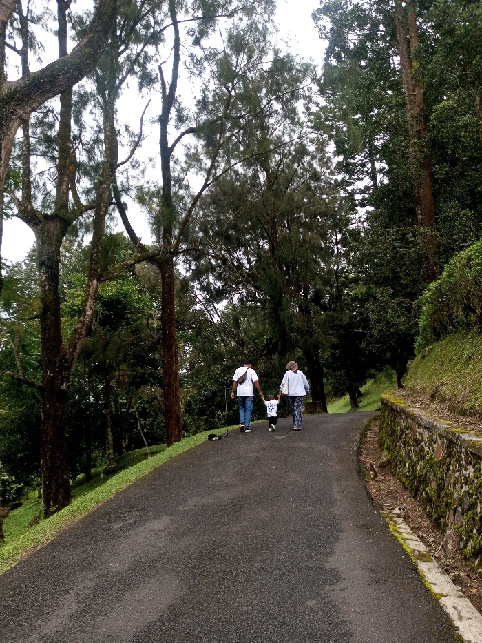 This image depicts a paved asphalt road winding through a densely wooded area in Padegaon, India. Three individuals are walking away from the camera, proceeding uphill on the road. A male subject, wearing a white t-shirt, blue jeans, and a shoulder bag, walks on the left. A young child, dressed in a white t-shirt with a dark graphic and dark pants, is positioned in the center, holding hands with both adults. A female subject, wearing a light-colored long-sleeved top, patterned pants, and a head covering, walks on the right. The road appears damp. To the right of the road, a stone retaining wall covered in moss runs alongside, with an embankment of green grass above it. To the left, a grassy slope descends into further foliage. Tall trees with dark trunks and lush green canopy dominate the scene on both sides of the road, extending towards an overcast sky. A small, dark object, possibly a bag or animal, is visible on the left edge of the road near the male subject.