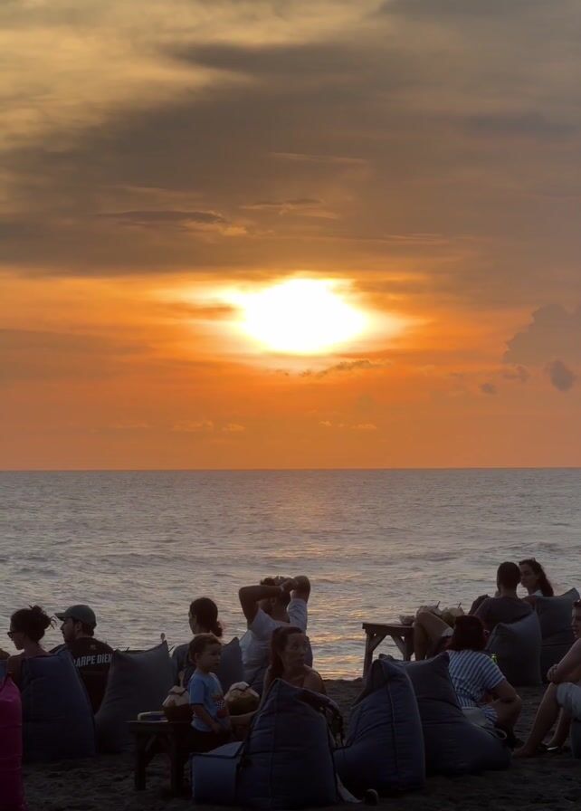 group of people relaxing on a beach at sunset. They are sitting in beanbag chairs, drinking from coconuts and enjoying the view. The sun is setting over the ocean, creating a bright orange glow in the sky. The clouds are dark and dramatic, adding to the overall atmosphere. One person is walking towards the left of the frame. The beach has dark sand.