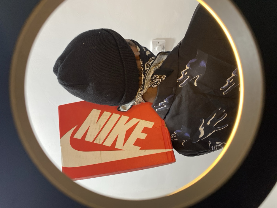 This image captures a partial view of an individual from the back, observed through a circular aperture with an illuminated golden-yellow rim. The scene is located indoors in Tomefa, Ghana. The person wears a black knit beanie, a black and white paisley-patterned bandana covering the lower portion of their face and neck, and a dark short-sleeved shirt adorned with a repeating pattern of stylized hands in shades of white and blue. A large, red Nike shoe box with the white "NIKE" logo prominently displayed vertically is positioned on the individual's left shoulder. The background consists of a plain, light-colored wall, upon which a small white square device with a central black rotary dial is mounted to the right of the individual's head. The individual is stationary, facing away from the camera.