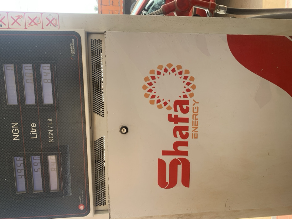 This image captures a close-up, angled view of a Shafa ENERGY fuel dispenser located at a gas station in Kubwa, Nigeria