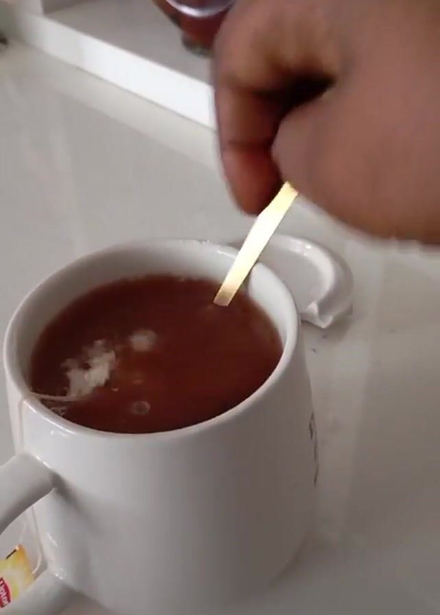 A hand places a dollop of white cream on top of a mug of tea, then uses a wooden stick to stir it into the tea