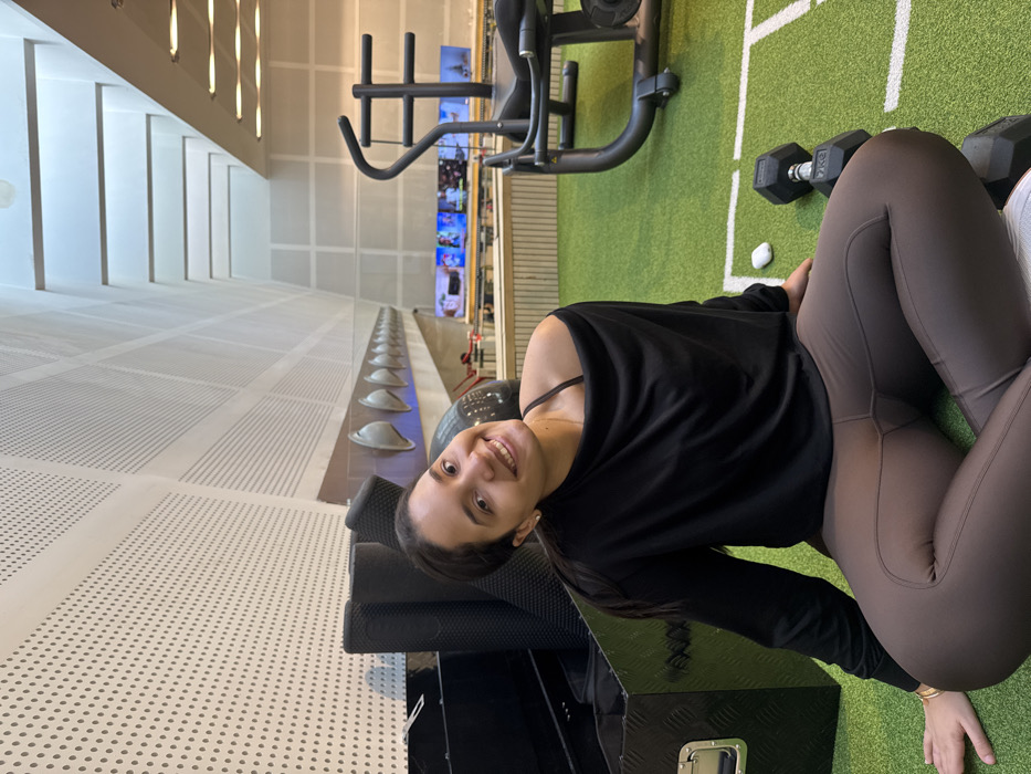 A female subject is seated cross-legged on green artificial turf with white grid lines, smiling directly at the camera, inside a modern indoor sports facility