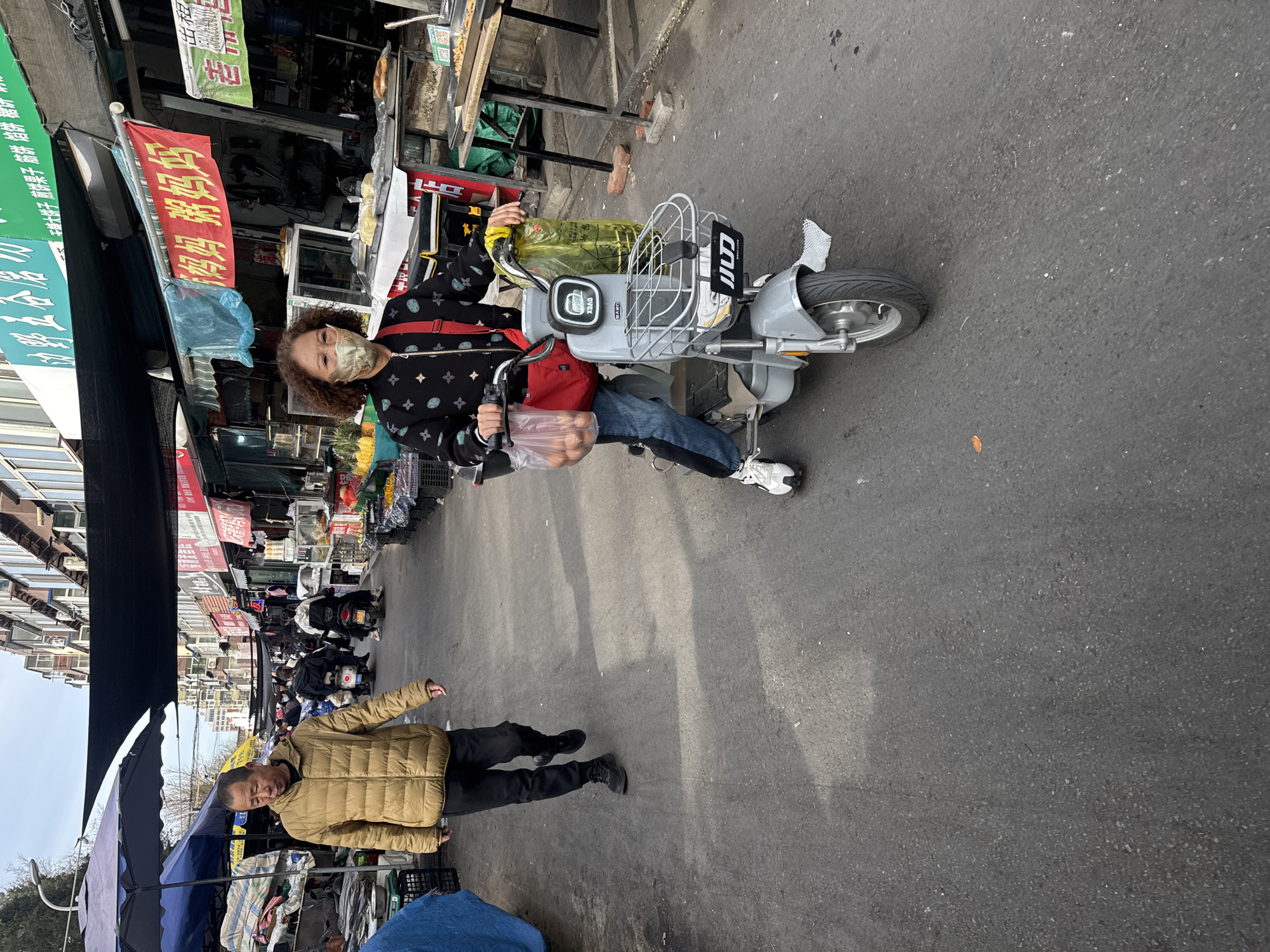 The image captures a bustling street scene in what appears to be a market or shopping district in Guta, China. The main subject is a person wearing a patterned black jacket, blue jeans, and white sneakers, sitting on a gray scooter with a basket and a red bag. This person is also wearing a face mask. In the lower part of the image, another person wearing a tan jacket and black pants is visible. The background is filled with vendors, awnings, and signs with Chinese characters, including the words "妈妈" (māmā, mother) and other market-related inscriptions. The environment consists of a paved street and buildings. The overall impression is of a lively commercial area in Guta.