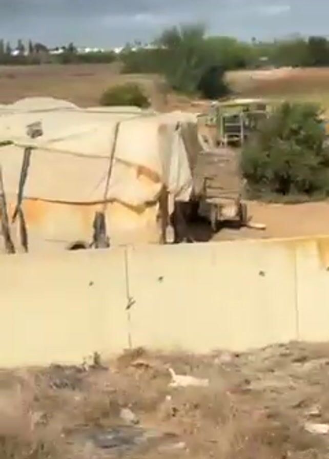 rapid, ground-level, view of a rural landscape under an overcast sky. The camera quickly passes by vegetation and a partially destroyed structure. The structure is made of cinder blocks and red bricks and is covered with a white tarp. The landscape includes barren fields with sparse vegetation. In the distance are vague outlines of what appears to be low-lying buildings.