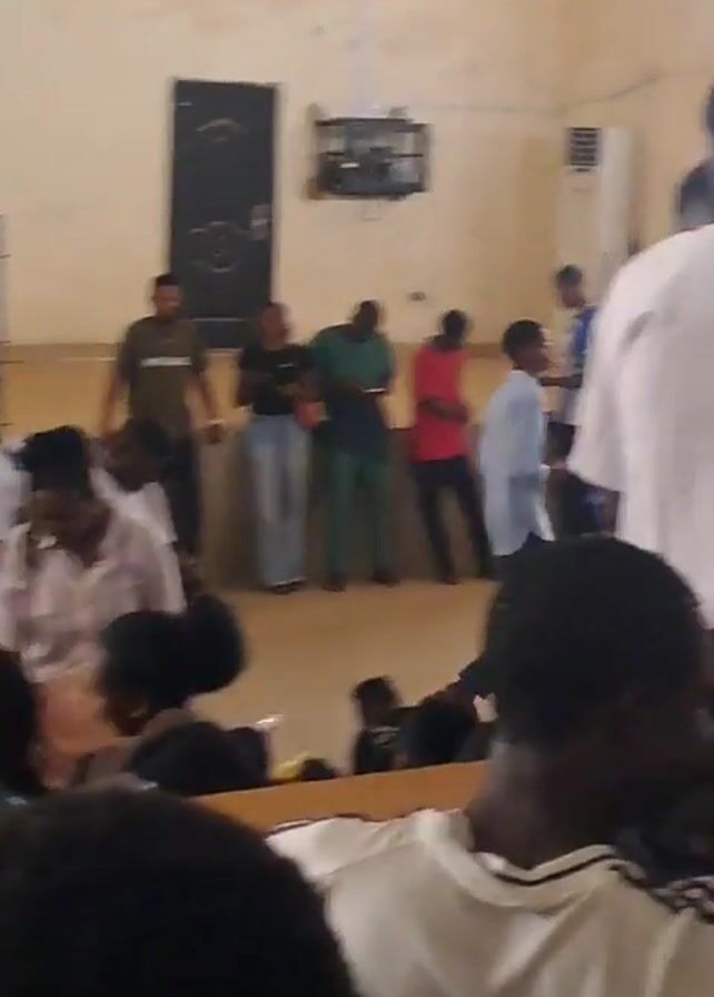 room filled with people, mostly students, in what appears to be a classroom or lecture hall