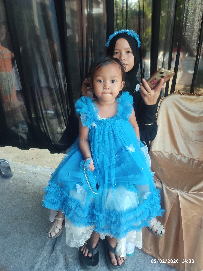 A young child in a frilly blue dress sits on someone's lap, holding a pearl necklace. An older girl in a black hijab and matching blue headband is behind, looking at a cell phone with a floral case. The background includes a dark curtain, a window, and a gold-covered chair. Sandals and flip-flops are visible on the floor. The date "05/02/2026" is stamped at the bottom right of the image.