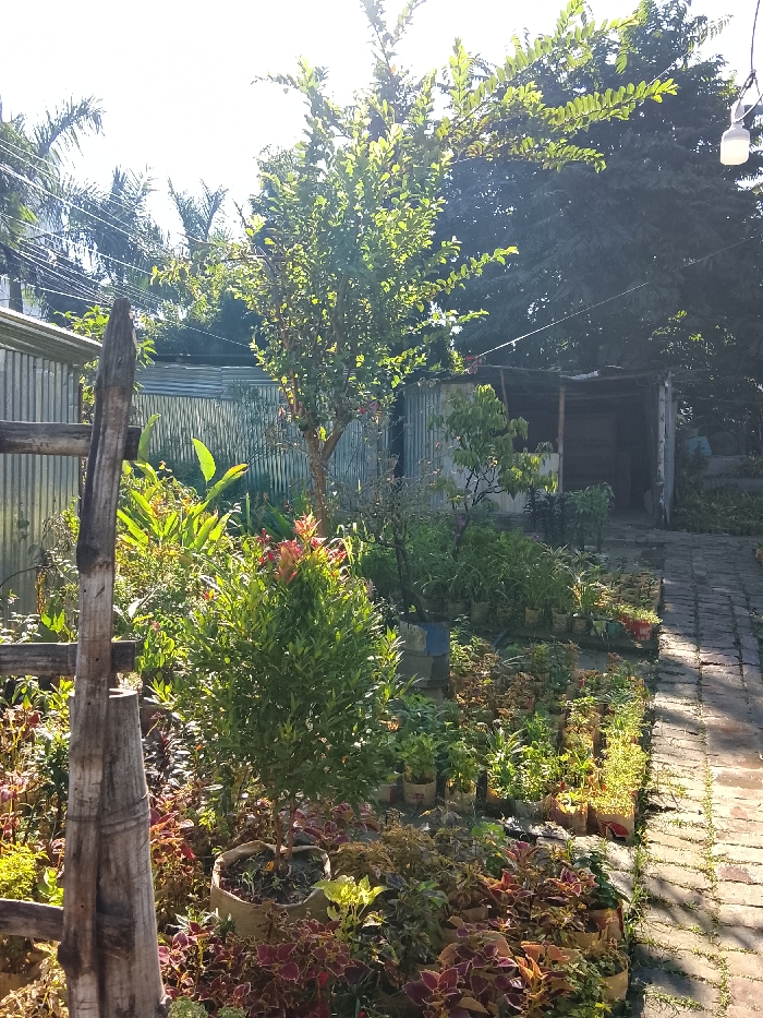 A lush garden scene, vibrant with greenery and colorful plants. A small tree with red-tipped leaves stands out, surrounded by potted flowers and foliage. In the background, corrugated metal structures and a small shed create a rustic backdrop. A weathered wooden post is visible in the foreground, adding to the natural, somewhat unkempt aesthetic. A brick path leads towards the shed, dappled with sunlight.
