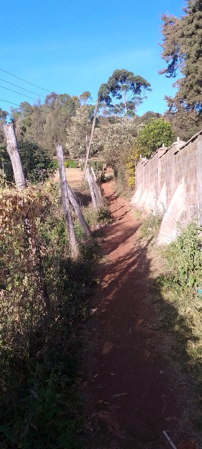 The image displays an unpaved, reddish-brown dirt path situated in Ngong ward, Kenya