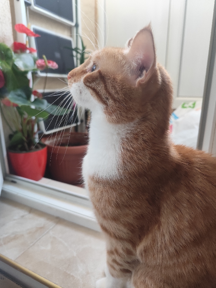 An indoor scene, likely within a residence in Varna, Bulgaria, captures a ginger and white tabby cat. The cat is seated on a light-colored, subtly veined tiled floor, angled slightly to the right, with its head turned left and tilted upwards, gazing out of frame. Its fur is orange with distinct tabby stripes, complemented by white fur on its chest, chin, and partially visible front paws. Prominent white whiskers extend from its muzzle, and a light blue-grey iris is visible in its left eye. The background features a white-framed window or balcony door, reflecting elements of the interior. Visible reflections include a red anthurium plant with green leaves and vibrant red spathes in a red cylindrical pot, a brown cylindrical pot to its right, and a light-colored, multi-tiered structure positioned behind the plants.