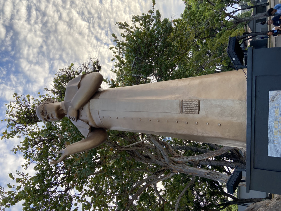 A statue of a man wearing glasses and a long garment stands outdoors. The statue is a light bronze color and has buttons down the front. A plaque is on the side of the pedestal, while trees with green leaves surround the statue. The sky is filled with wispy clouds. Some people can be seen in the background behind the statue.