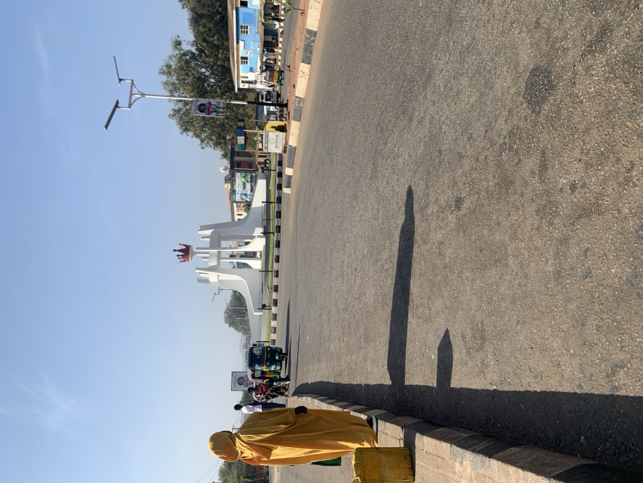 The image captures the Jos Main Market Roundabout, also identified as Terminus Roundabout or Jos Crown Roundabout, in Jos, Nigeria. The scene is illuminated by direct sunlight under a clear, light blue sky. In the foreground on the left, a person wearing a full-length, hooded yellow garment stands on a paved curb, facing towards the roundabout. A yellow plastic jerrycan rests on the curb beside this individual. An elongated shadow, consistent with a low sun angle, extends from the person across the asphalt road surface. The central feature is a large, white, multi-tiered monument culminating in a red crown, situated on a grass-covered island within the roundabout. A dark metal fence encircles the base of this island. Near the roundabout island, several individuals are visible, including two men in white shirts. A green and yellow Keke Napep (auto-rickshaw) and a motorcycle are present on the road adjacent to the island. A large billboard featuring a person is affixed to the roundabout island structure. On the right side of the frame, a tall streetlight pole equipped with solar panels and dual light fixtures stands alongside the road. Behind it, a row of single and two-story buildings lines the street. One building is distinct with its light blue facade and white trim. Green trees are visible in the mid-ground and background, particularly behind the buildings and around the periphery of the roundabout. The asphalt road appears dry.