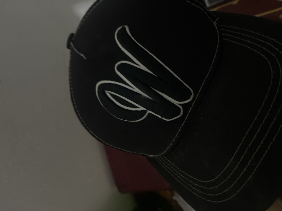 The image depicts a close-up, angled view of a black baseball cap, situated indoors in Flor Amarillo, Venezuela