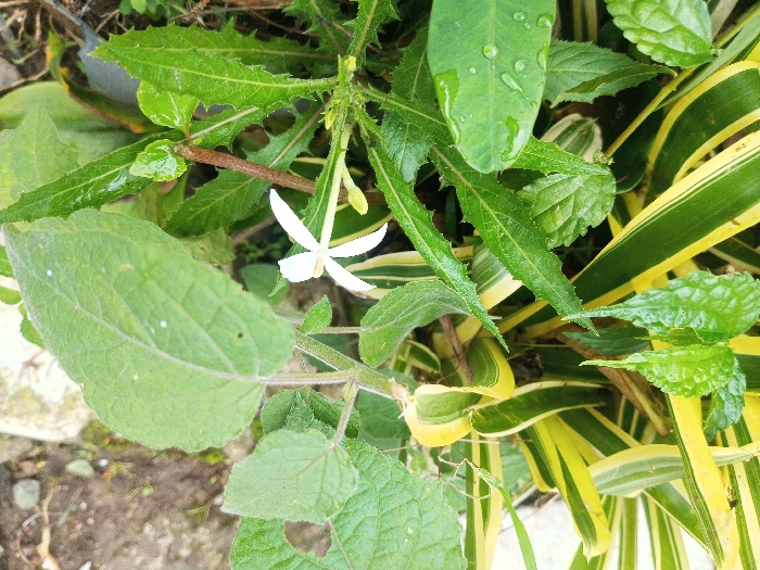 The image displays a close-up, top-down view of various plant foliage in what appears to be a garden or planted area within the city of Khammam, India. A prominent white, star-shaped flower with five slender petals is visible slightly off-center, positioned amidst green leaves. The flower is attached to a thin, reddish-brown stem. Surrounding the flower and its stem are several types of green leaves, some exhibiting water droplets on their surfaces, indicating recent moisture. To the upper right and lower right sections of the frame, a distinct plant with long, strap-like leaves featuring prominent yellow and green vertical stripes is visible. Other leaves present include broad, ovate green leaves and narrower, serrated green leaves. The lower left portion of the image reveals dark, moist soil with fragments of light-colored stone or concrete. No individuals or animals are present in the scene.