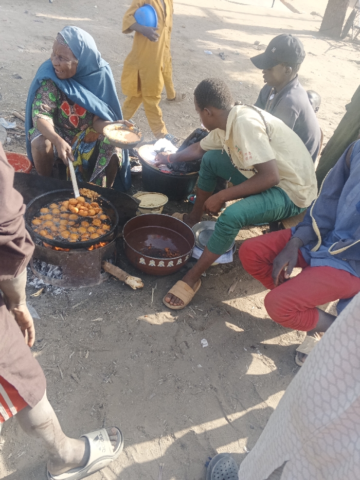 This image depicts an outdoor food preparation and vending scene in Kwachiri, Nigeria