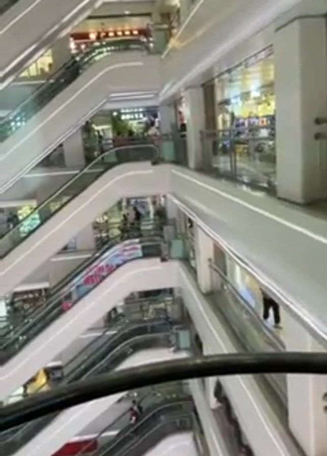 The camera angle points upwards, revealing a multi-story shopping mall with a complex arrangement of escalators