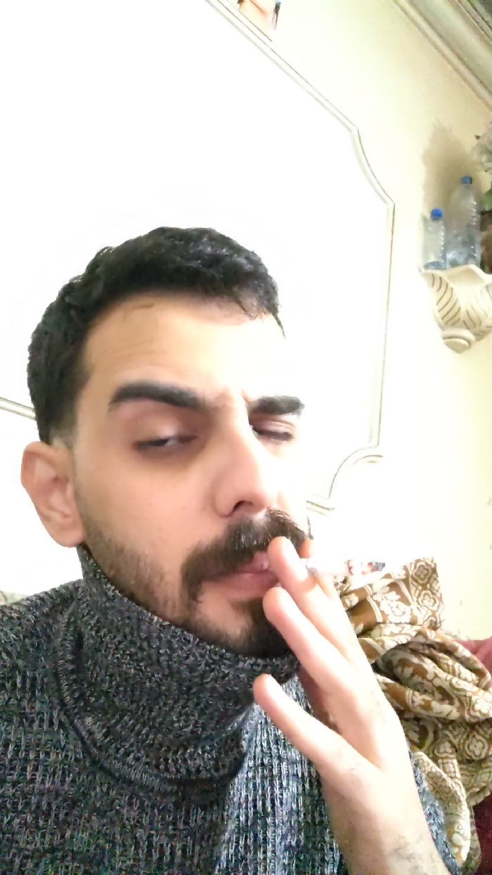 The image displays a male individual, seen from the upper chest upwards, in an indoor setting within Al-Qaboun Municipality, Syria. He has dark, short hair, a mustache, and a beard. His eyes are partially closed or directed downwards. He is wearing a dark, textured turtleneck sweater. His right hand, positioned near his mouth, holds a lit cigarette between his thumb and forefinger. The background consists of a light-colored wall featuring a decorative architectural molding. To the right, a wall-mounted shelf holds two plastic water bottles, one larger than the other. Below the shelf and to the right of the individual's shoulder, a pile of patterned brown and beige fabric is visible.