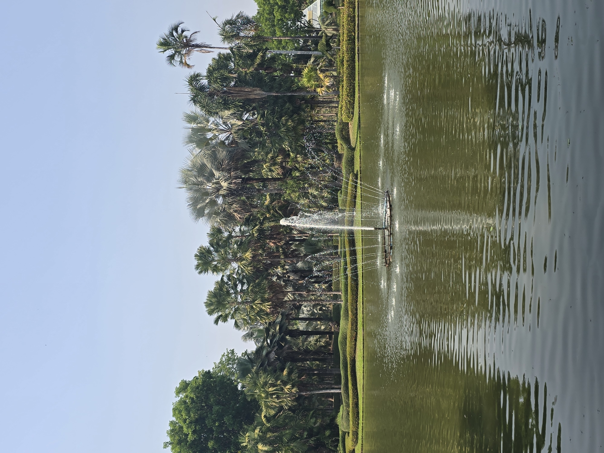 An outdoor scene in Ban Phaya Kot Ana Kaeo, Thailand, depicts a landscaped park setting centered around a large body of olive-green water. A multi-tiered fountain is active in the middle of the water, emitting a primary vertical stream and multiple outward-spraying jets, creating concentric ripples on the surface. The water reflects the overhead light blue sky, which is clear and cloudless. The far bank of the water is delineated by a line of meticulously trimmed green hedges. Behind the hedges, a dense array of trees forms the background, predominantly comprising various tall palm trees with green and grayish fronds, interspersed with other broadleaf trees. On the far right, a light-colored, possibly pyramidal-roofed structure is partially visible amidst the foliage. No individuals or animals are present.