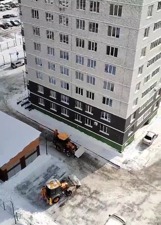A high-angle shot shows a winter scene with a tall apartment building as the dominant feature. Two yellow snowplows are actively clearing snow from the ground-level areas. Parked vehicles are partially covered in snow. The surrounding environment consists of snow-covered ground, streets, and other buildings. The sky is bright, suggesting daylight.