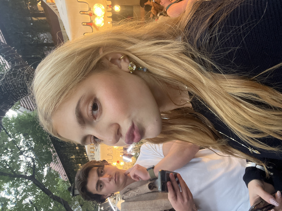 A selfie features a fair-skinned woman with blonde hair, gold hoop earrings, and a statement flower earring on her left ear