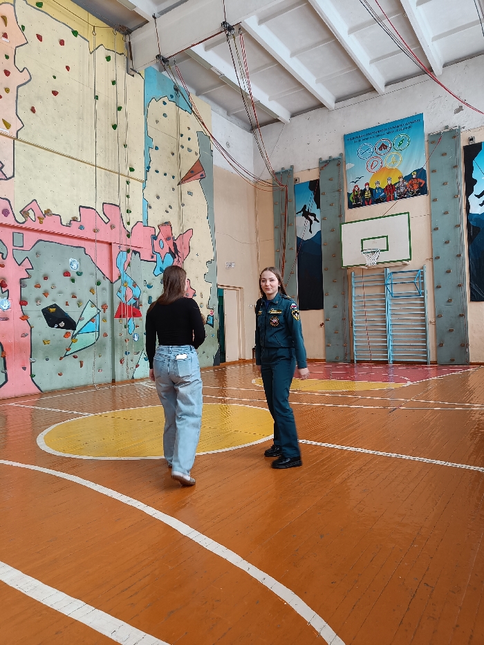 This image depicts an indoor gymnasium or sports hall. Two young females are present. On the left, a female is seen from the back, wearing a black long-sleeve top, light blue jeans, and light-colored shoes, appearing to walk towards the left side of the frame. On the right, a second female is standing, facing the camera with a slight smile. She wears a dark uniform, consistent with that of the Russian Ministry of Emergency Situations (EMERCOM), featuring patches on the sleeves, dark trousers, and black shoes. The environment includes a prominent rock climbing wall on the left, painted in abstract pink, grey, light blue, and yellow patterns, equipped with numerous colorful climbing holds and ropes extending from the ceiling. The right wall features a basketball backboard with a white hoop and net. Flanking the basketball setup are two tall, dark banners depicting rock climbers. Above the basketball hoop, a wider banner displays a diverse group of figures and text in Cyrillic. The floor is a polished wooden gymnasium surface with distinct orange, yellow, and white court markings. The ceiling is white and paneled, with visible support beams. A light-colored doorway is visible in the background, between the climbing wall and the right wall. The precise location within Sarapul, Russia, is not discernible from the image.