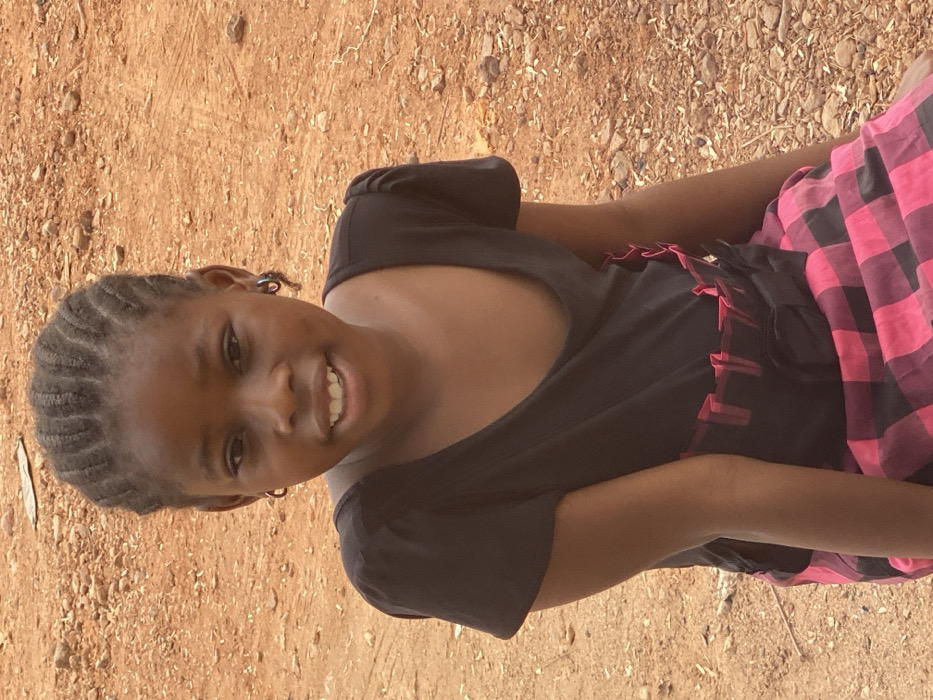 A young girl with braided hair smiles at the camera. She wears small hoop earrings, a black, short-sleeved shirt, and a pink and black checkered skirt. The background is blurry, suggesting an outdoor setting with dirt and small rocks. Her skin appears smooth and her teeth are visible in her smile. The image is rotated.