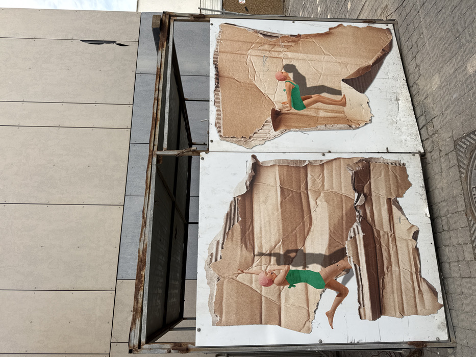 The scene is situated in the city of Tel-Aviv, Israel, depicting an urban outdoor environment. A corroded, open-frame metal structure, approximately 2.5 meters wide and 1.5 meters high, is positioned centrally, exhibiting significant rust on its upper horizontal bars. Two large white rectangular panels are affixed vertically to the lower front of this metal frame with visible screws. Each panel displays a photographic print creating a trompe l'oeil effect of torn and crumpled brown corrugated cardboard. On the left panel, a pale-skinned female figure, rendered in a stylized manner, is depicted mid-action, seemingly leaping or climbing. She wears a vibrant green one-piece swimsuit and a pink swimming cap. Her left leg is extended, her right leg bent, and both arms are raised as if gripping the simulated torn cardboard. Her mouth is open, and a distinct shadow is cast behind her to her right. On the right panel, a second pale-skinned female figure, identically dressed in a green swimsuit and pink cap, is shown in a forward-bent, diving preparation posture, balanced on a simulated cardboard ledge. Her arms are extended towards the ground, and she looks downwards. A prominent shadow extends behind her. The background features a building facade constructed from light beige rectangular panels with visible fasteners, situated above a section of darker grey rectangular panels. A vertical dark gash or tear is present on the upper right beige panel. The ground surface in the immediate foreground is paved with interlocking grey and tan pavers. A circular metal manhole cover is partially visible at the bottom center.