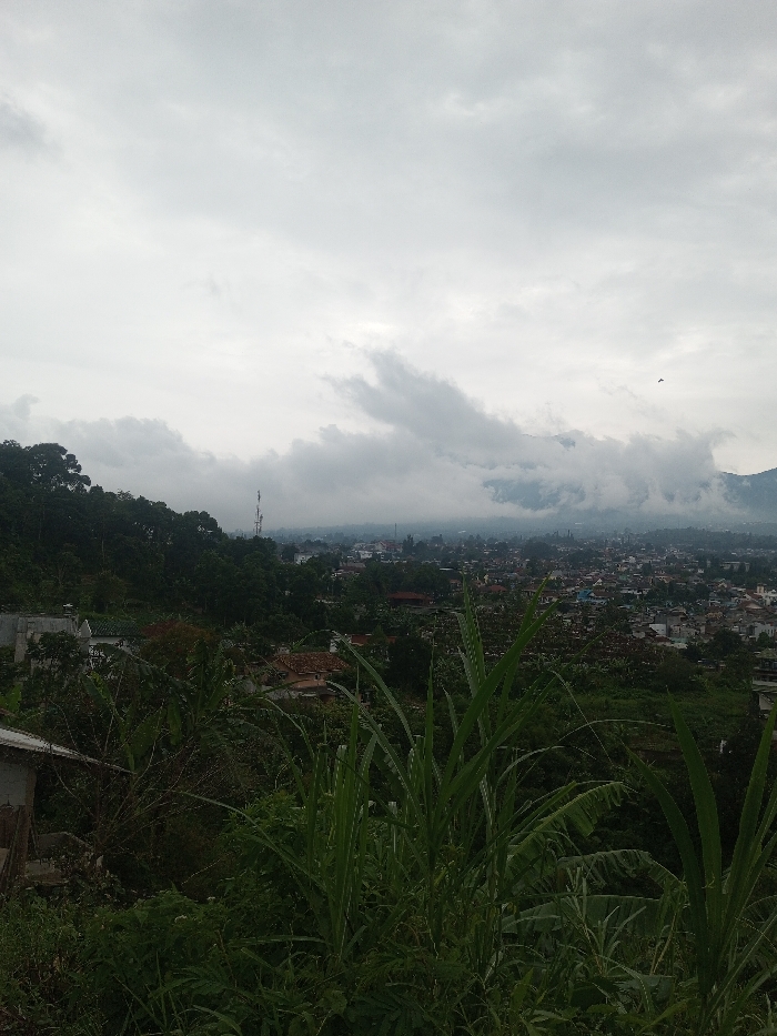 The scene presents an elevated, panoramic view of the city of Bhupalpally, India, observed under a heavily overcast sky. The immediate foreground is dominated by dense green vegetation, primarily consisting of tall grasses and leafy plants. On the far left, a portion of a structure with a light-colored roof is visible beneath this foliage. In the midground, a forested hillside extends on the left, hosting a tall communication tower. Below and extending into the background is the urban area of Bhupalpally, characterized by numerous closely built structures, predominantly with dark or gray rooftops, intermingled with areas of green foliage. The distant background features mountains partially obscured by thick, low-lying clouds or mist, which blend into the uniformly gray, cloudy sky. A small, dark avian form is visible in the upper-right quadrant of the sky. No human subjects or explicit actions are discernible.