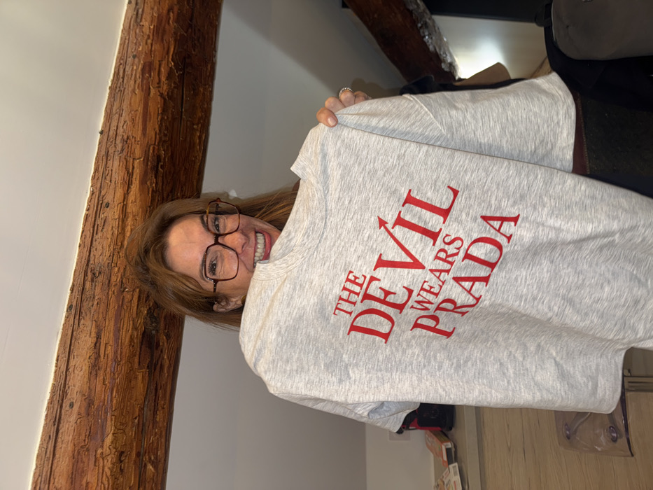 A Caucasian woman with shoulder-length reddish-brown hair and tortoise-shell square-framed glasses smiles widely, revealing teeth, while holding up a light gray, short-sleeved t-shirt in an indoor setting in Villeurbanne, France. The t-shirt prominently displays the phrase "THE DEVIL WEARS PRADA" in bold red capital letters, with stylized "V" and "A" characters featuring pointed tops. A ring is visible on her left hand's ring finger. The background features a large, dark brown exposed wooden beam running horizontally across the upper third of the frame. A light-colored wall is visible behind the woman, and a light-toned furniture piece with a few indistinct objects rests to the left.