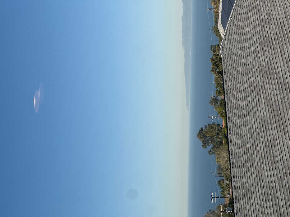 The scene captures a serene view where the sky meets the water. A hazy atmosphere obscures the distant mountains, adding depth to the landscape. Utility poles line the edge of the water, interspersed with trees. In the foreground, a textured gray roof provides a stark contrast to the natural elements beyond. The image exhibits a vertical orientation with a slightly tilted perspective.