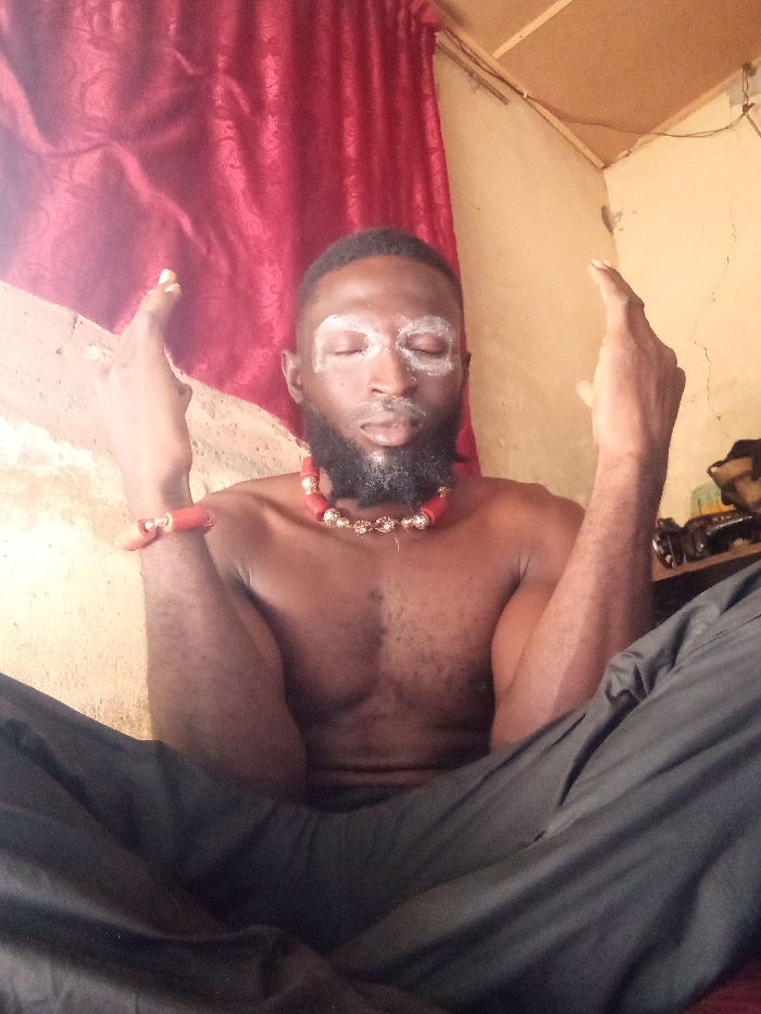 One adult male is depicted in a seated, cross-legged posture within an indoor setting. The individual possesses a dark complexion, a full beard, and his eyes are closed. White powdery substance is applied in a circular pattern around each eye. He is bare-chested, revealing a muscular build, and wears a necklace composed of red cylindrical beads interspersed with gold-colored spherical ornaments. A matching red beaded bracelet is worn on his left wrist. He is dressed in dark-colored trousers, possibly black or dark grey. Both forearms are raised, with hands positioned vertically, fingers extended upwards and slightly splayed. The background consists of a textured, light beige or off-white wall with visible cracks and imperfections on the right side and behind the subject. A red curtain, possibly velvet, hangs on the left side of the frame. The upper right portion of the image reveals a light-colored wooden ceiling or panel. A dark, unidentifiable object rests on a surface in the far right background. The overall environment appears to be a modest interior.